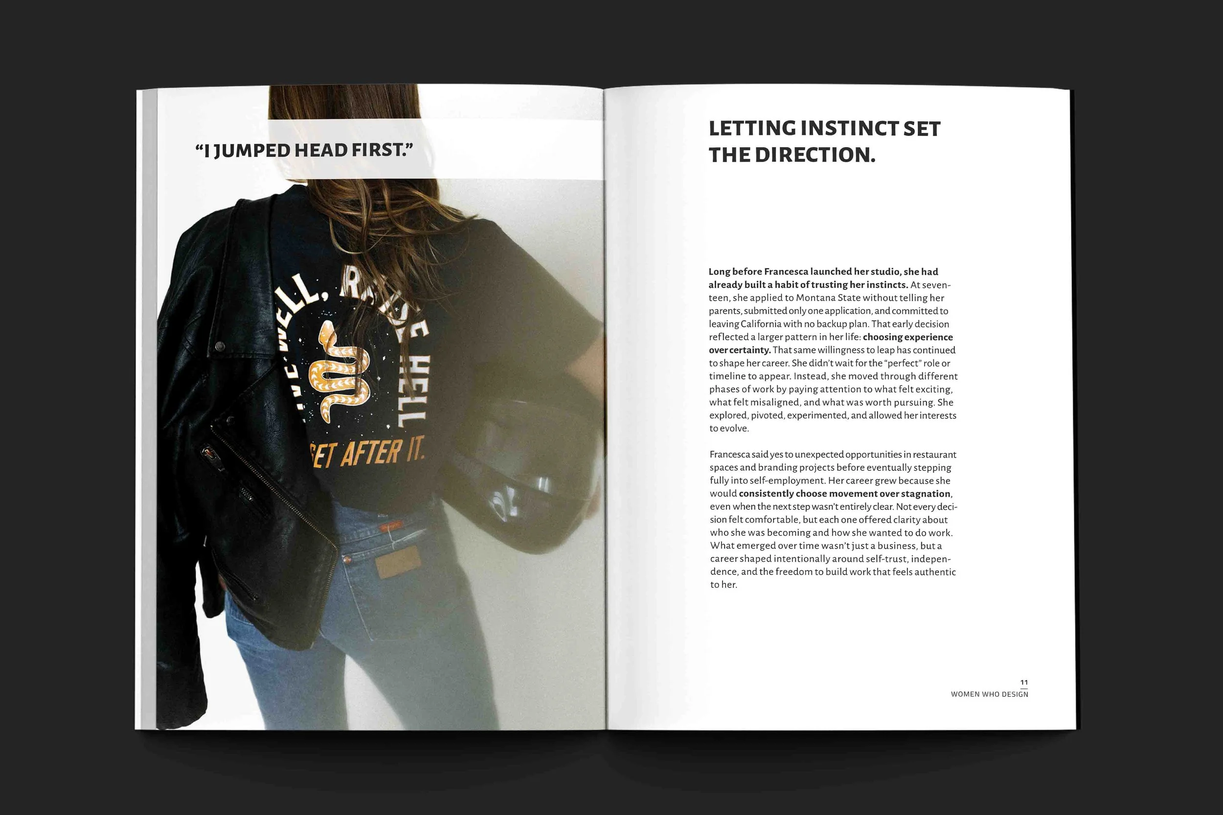 Long before Francesca launched her studio, she had already built a habit of trusting her instincts. At seventeen, she applied to Montana State without telling her parents, submitted only one application, and committed to leaving California with no backup plan. That early decision reflected a larger pattern in her life: choosing experience over certainty. That same willingness to leap has continued to shape her career. She didn’t wait for the “perfect” role or timeline to appear. Instead, she moved through different phases of work by paying attention to what felt exciting, what felt misaligned, and what was worth pursuing. She explored, pivoted, experimented, and allowed her interests to evolve.