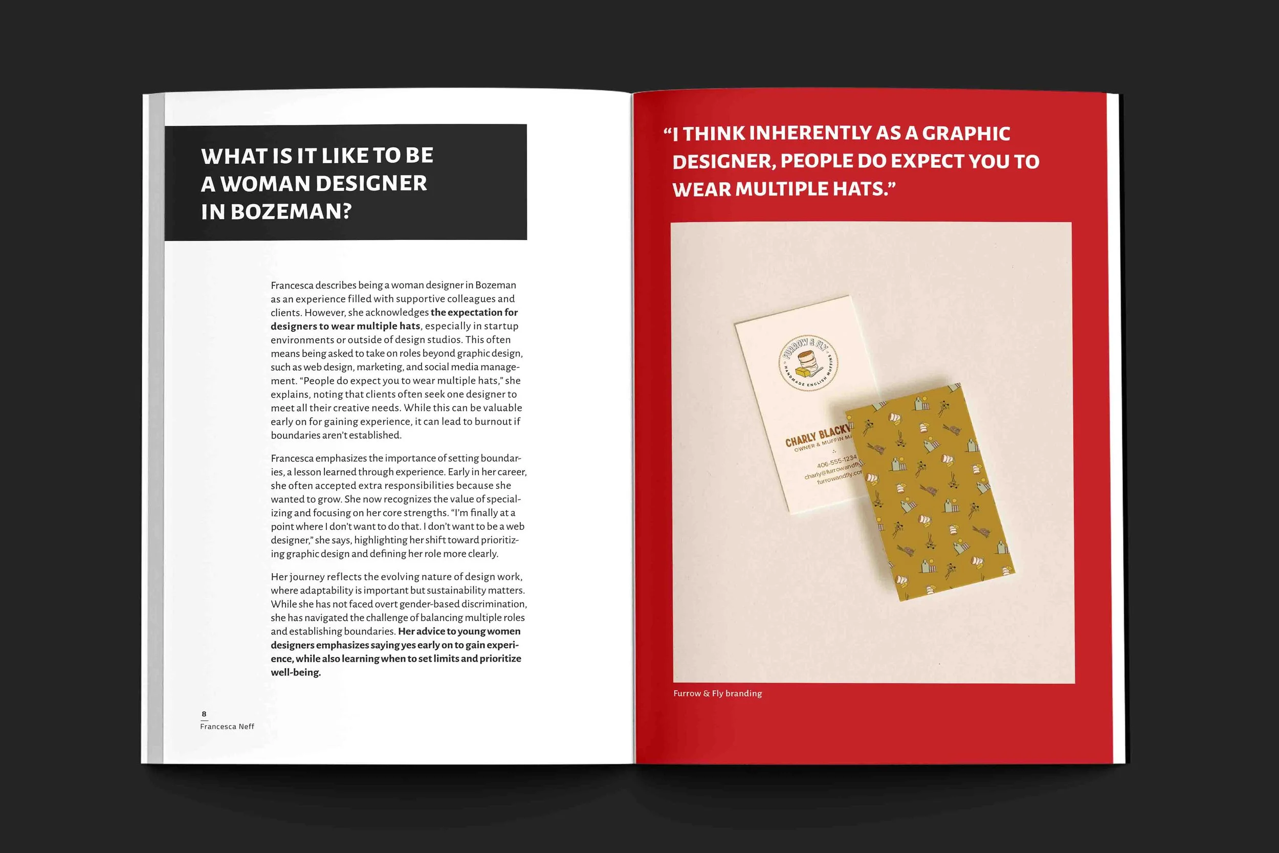 Francesca describes being a woman designer in Bozeman as an experience filled with supportive colleagues and clients. However, she acknowledges the expectation for designers to wear multiple hats, especially in startup environments or outside of design studios. This often means being asked to take on roles beyond graphic design, such as web design, marketing, and social media management. “People do expect you to wear multiple hats,” she explains, noting that clients often seek one designer to meet all their creative needs. While this can be valuable early on for gaining experience, it can lead to burnout if boundaries aren’t established.