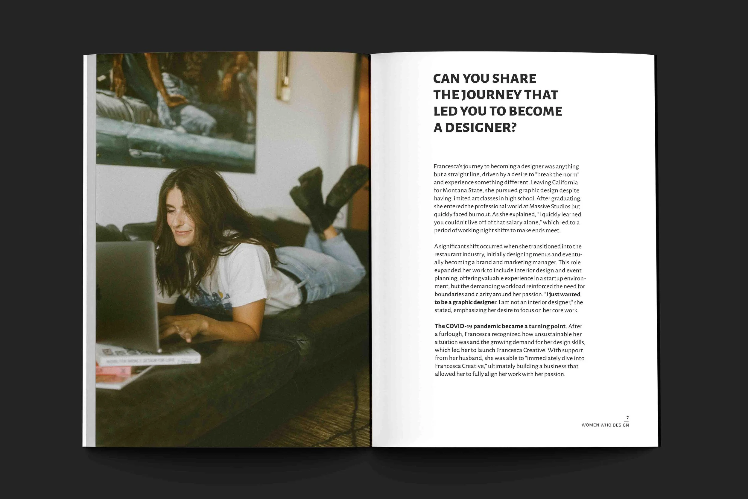 The COVID-19 pandemic became a turning point. After a furlough, Francesca recognized how unsustainable her situation was and the growing demand for her design skills, which led her to launch Francesca Creative. With support from her husband, she was able to “immediately dive into Francesca Creative,” ultimately building a business that allowed her to fully align her work with her passion.